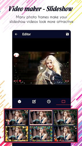 * Frame and time slideshow: Lots of beautiful and varied frames for your video to be unique. You can also edit the video speed quickly or slowly by selecting the duration of the slideshow.