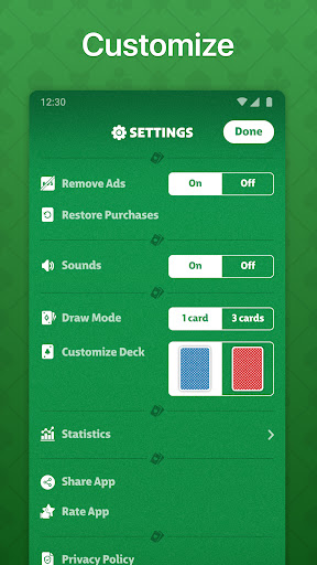 Play the best free classic solitaire card game just the way you like it. Change the look of the table, customise the deck of cards front and back and have fun! You can even make Solitaire sound the way you want!